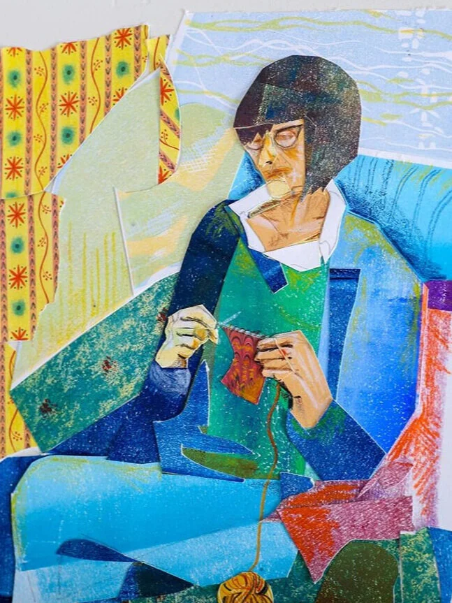 I make relief prints, using lino or woodcuts, capturing moments in life. I use collage to tell stories and illustrate the words we say!